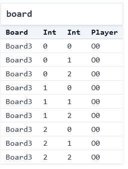 `Board0.board = (0, 0) -> `X +  -- the partial function for the board's