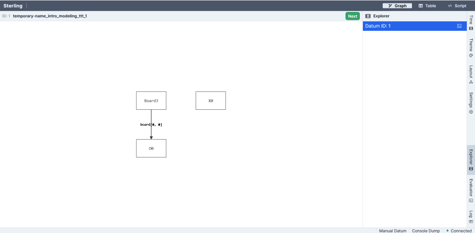 Notice that, because we said exactly 2 Board here, Forge must find instances containing 2 tic-tac-toe boards, and both of them must satisfy the constraints: wellformedness, X moving in the middle, etc. You could ask for a board where X hasn't won by adding not winner[b, X].