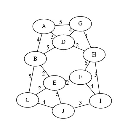 Exercise: Find a simple path (i.e., one with no repeated vertices) from vertex \(G\) to vertex \(E\) on the graph below.
