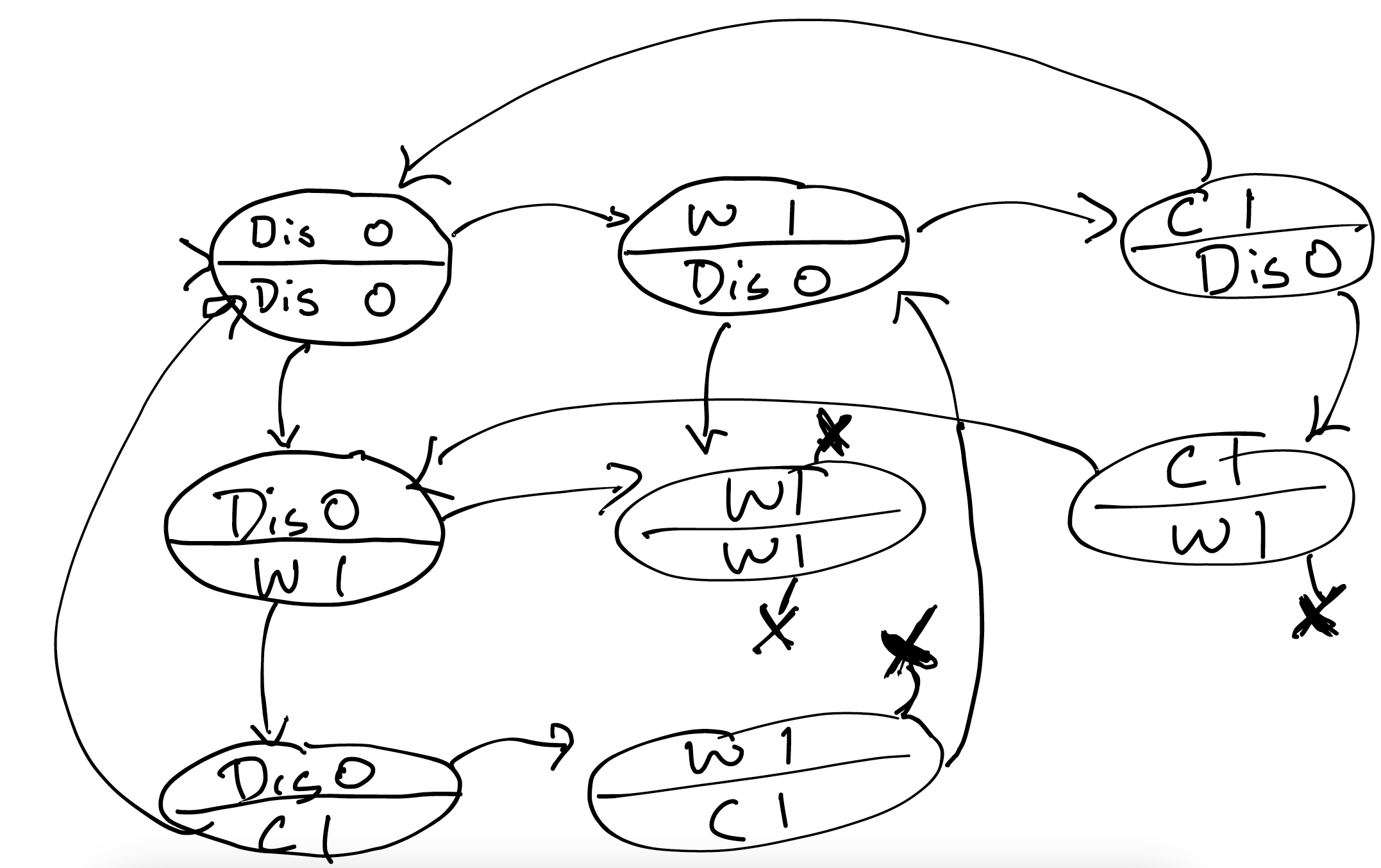 By drawing the entire graph of reachable states, we can see that the "bad" states are not reachable. This protocol satisfies mutual exclusion (as Forge showed us in the last section).