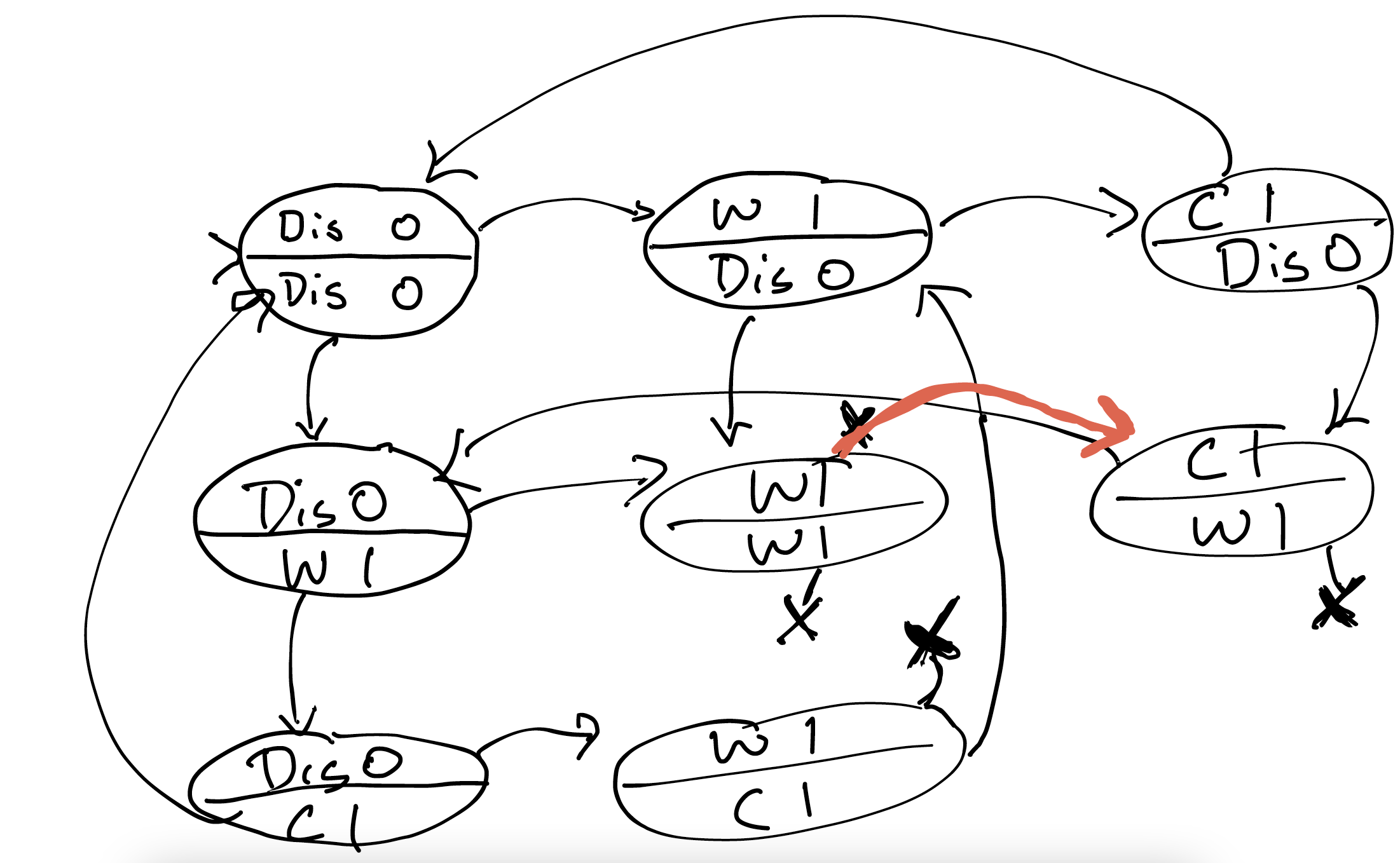 I've marked the inability of a process to make progress with an "X"; it's a transition that can't be taken.