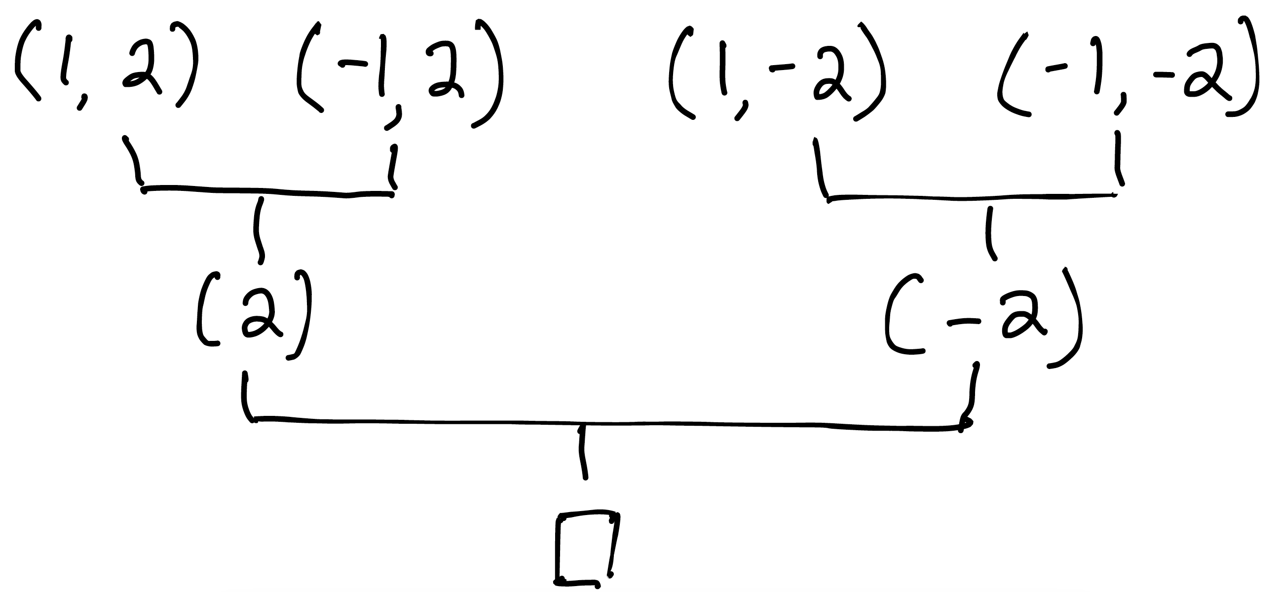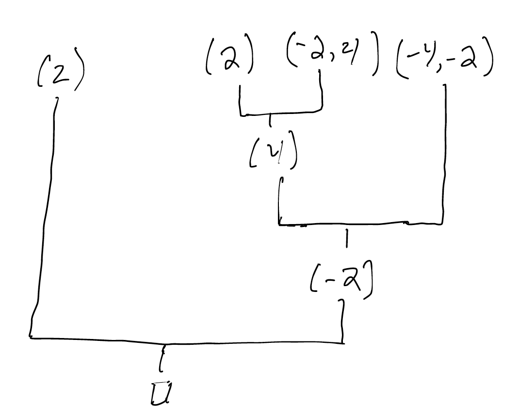 Let's rewrite the proof we generated before. We'll remove assumptions from the tree and recompute the result of every resolution step, resulting in a proof of something weaker that isn't contingent on any assumptions. To do this, we'll recursively walk the tree, treating inputs as the base case and resolution steps as the recursive case. In the end, we should get something like this: