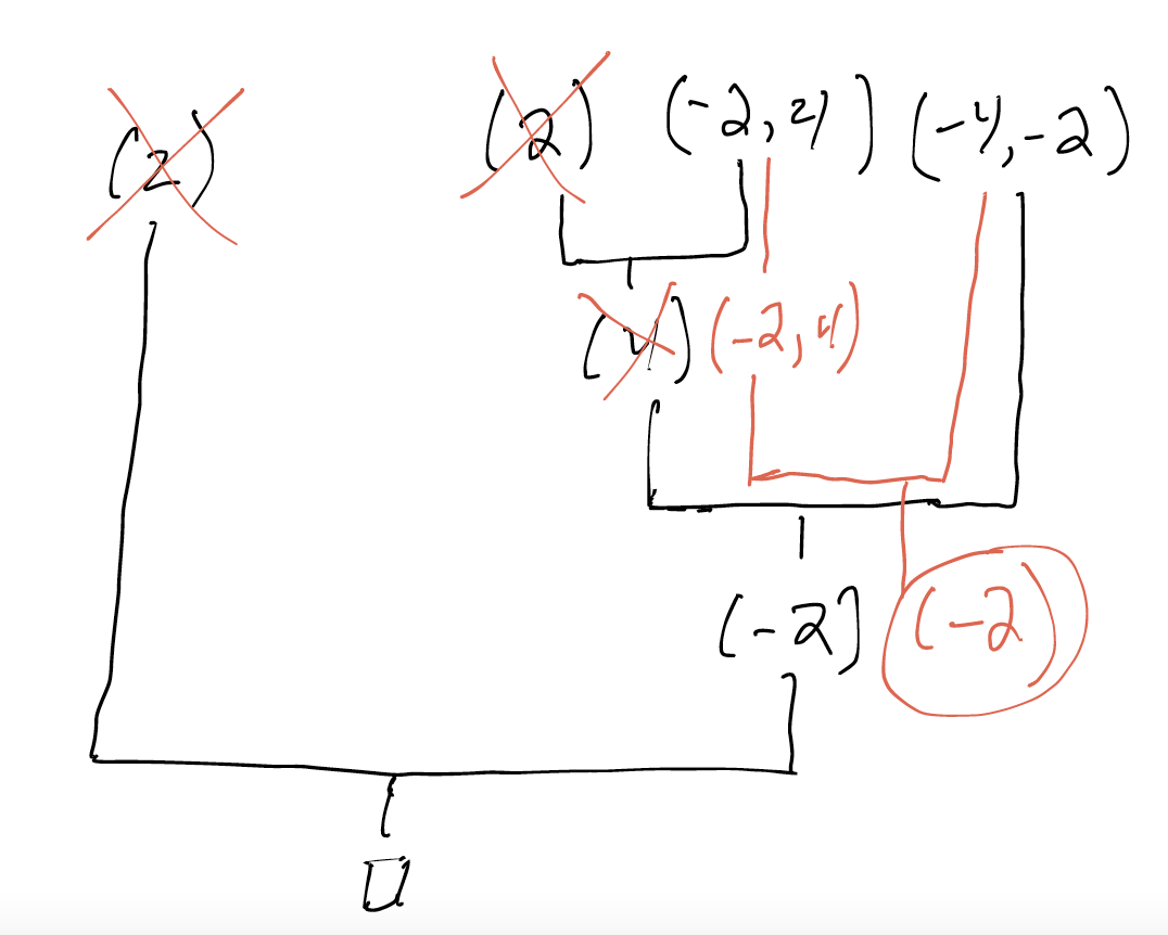 This is promising: we have a piece of the overall proof of unsatisfiability that we want. But we can't use it alone as a proof that the input is unsatisfiable: the proof currently has an assumption (2) in it. We'd like to convert this proof into one that derives (-2)---the negation of the assumption responsible---from just the input.